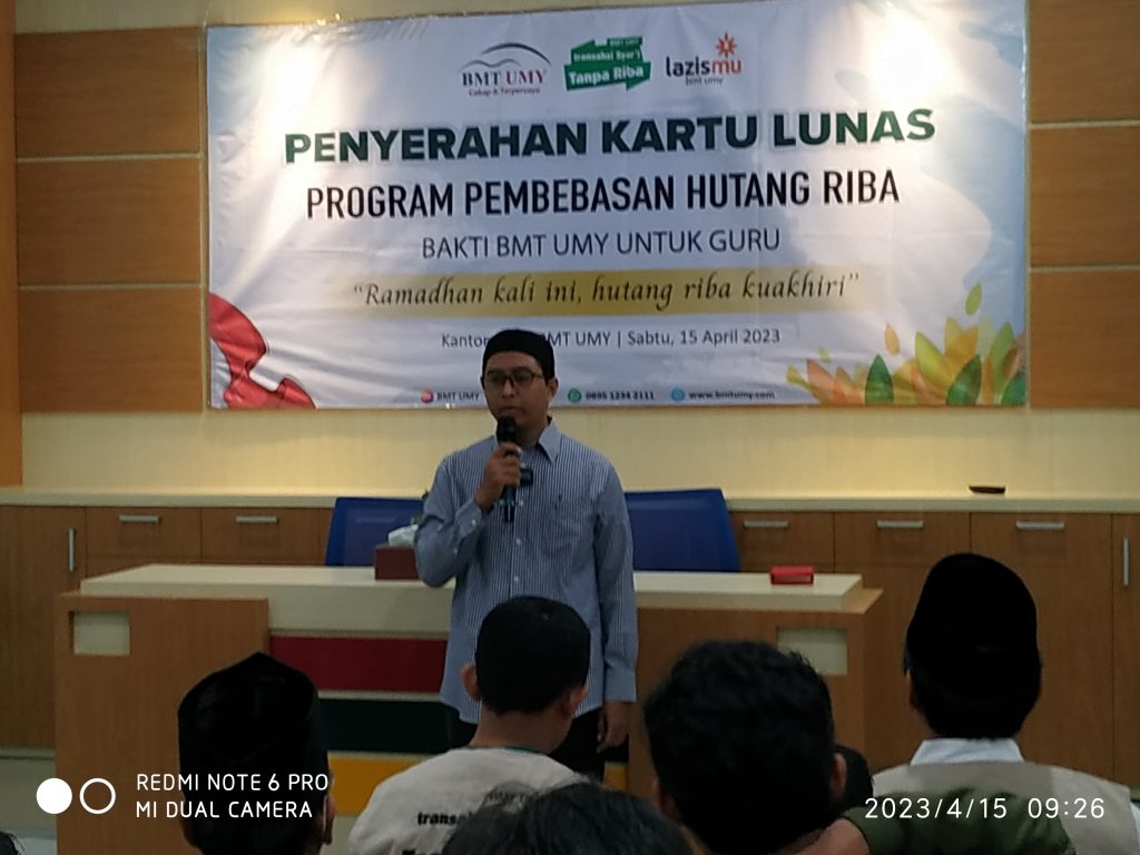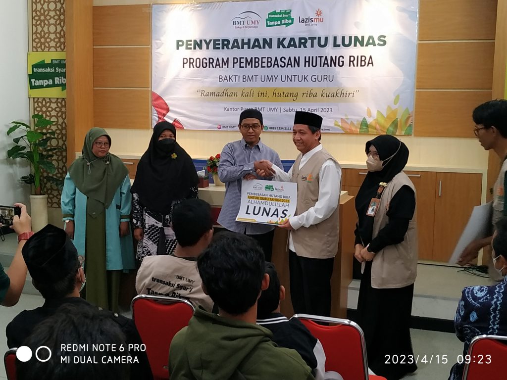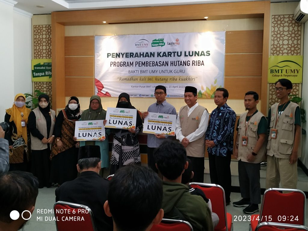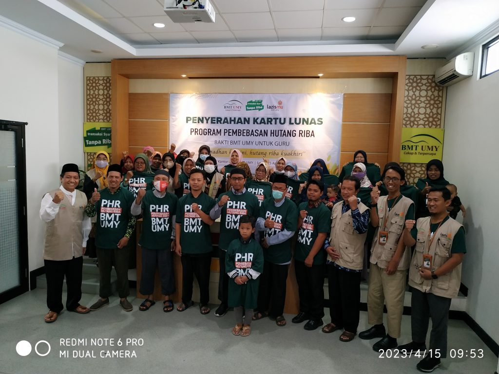 SUNMARINDO.COM (Yogyakarta) – BMT UMY memiliki program Pembebasan Hutang Riba (PHR) yang tahun 2023 ini diperuntukkan bagi guru se-DIY. Penyerahan kartu lunas PHR dilaksanakan, Sabtu (15/4/2023) di kantor pusat BMT UMY, Jalan Ibu Ruswo Yogyakarta.