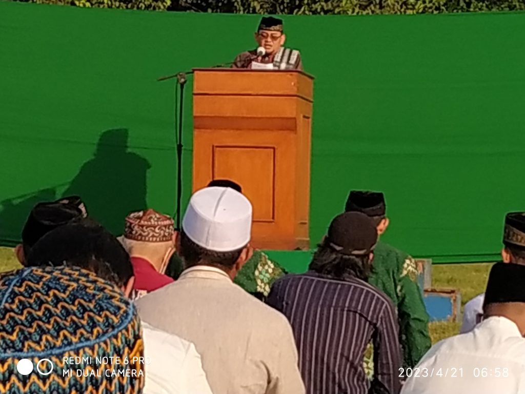 Ustadz yang bertindak selaku imam dan khatib H. Deddy Ahmad Jabir, Amd, SIP, MPA dengan mengambil tema “Menjadi Hamba Allah yang Paripurna”, dengan tegas menyampaikan tauziahnya kepada jamaah shalat Idul Fitri 1444 H agar setelah satu bulan menjalankan puasa Ramadhan dapat meningkatkan iman dan taqwanya kepada Allah SWT dengan berdzikrullah. Ibadah puasa itu mengolah raga, mengolah jiwa, mengolah rasa, mencerahkan rohani meningkatkan mutu aqidah, ibadah dan juga mu’amalah.