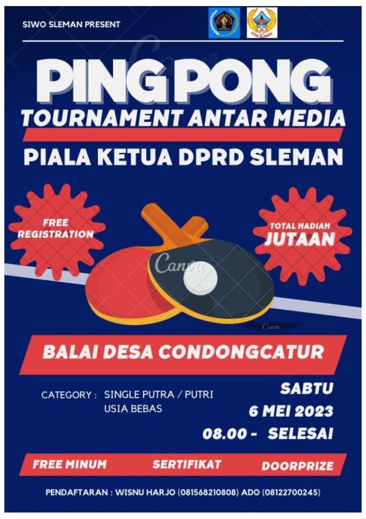 SUNMARINO. COM (Sleman) – Animo para pekerja media di DIY untuk ikut turnamen tenis meja sangat tinggi, yang akan dilaksanakan di Gedung Serbaguna Kalurahan Condong Catur Depok Sleman, Sabtu (6/5/23 yang akan datang. Sebenarnya target panitia untuk turnamen ini hanya 48 peserta, tetapi hingga Kamis (27/4) jumlah peserta yang mendaftar mencapai 55 orang.